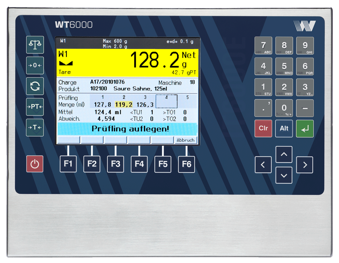 El indicador de peso WT6000 aprobado por W&M está diseñado para  aplicaciones industriales exigentes en la industria  química y farmacéutica, en la  industria alimentaria y en muchos otros sectores de la  industria. El diseño industrial con el  potente hardware modular y el concepto de  programabilidad gratuita hacen que el indicador de peso WT6000 sea el  terminal de pesaje ideal para soluciones estándar o  específicas de aplicaciones, por ejemplo, para: