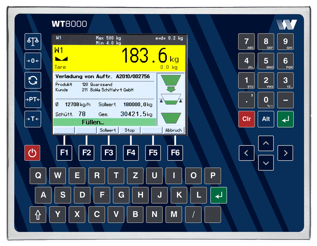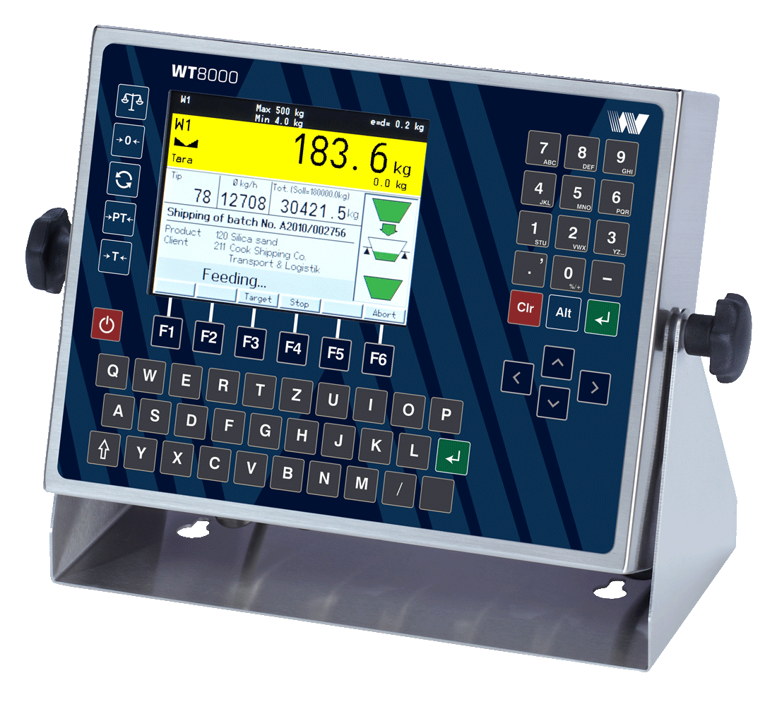 El indicador de peso WT8000 aprobado por W&M está diseñado para aplicaciones industriales exigentes en la industria química y farmacéutica, en la industria alimentaria y en muchos otros sectores de la industria. El diseño industrial con el potente hardware modular y el concepto de programabilidad gratuita hacen que el indicador de peso WT8000 sea el terminal de pesaje ideal para soluciones estándar o específicas de aplicaciones, por ejemplo, para:
